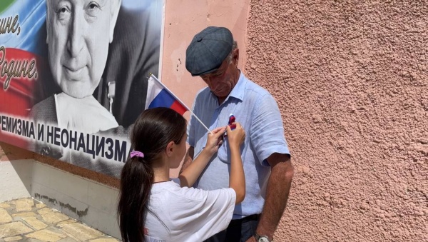 Воспитанники ЦДОД вместе с педагогами раздали жителям райцентра триколоры и со специалистом по делам молодежи развернули флаг России перед памятником павшим в ВОВ.