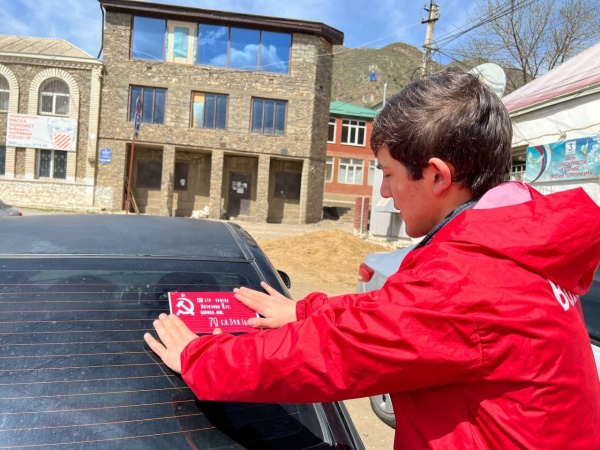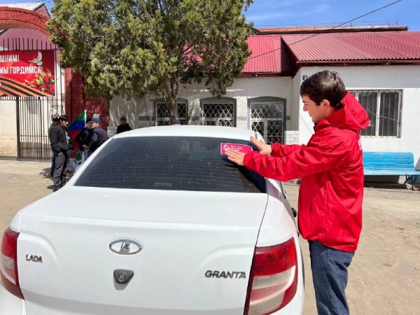 На автомашинах жителей Цуриба расклеили наклейки с изображением Знамени Победы.