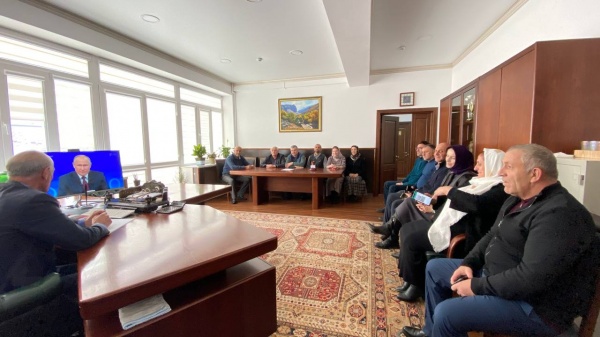 Работники аппарата администрации Чародинского района — заместители главы района, руководители структурных подразделений и специалисты, вместе смотрят в кабинете главы муниципалитета прямую линию Президента Российской Федерации Владимира Владимировича Путина.
