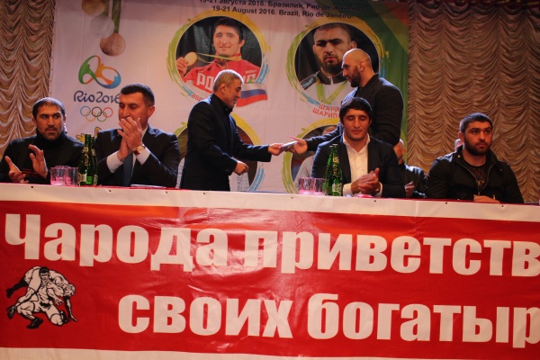 Глава района Мухидин Магомедов в своем выступлении поздравил всех собравшихся в зале с успехами чародинских ребят на Олимпиаде и поблагодарил спортсменов за такие результаты. Также слова благодарности глава района передал главе республики Рамазану Абдулатипову за необычный торжественный прием и чествование Абдулрашида Садулаева после победы на Олимпиаде, минспорту республики Дагестан и всем, кто занимался этими спортсменами.