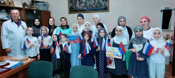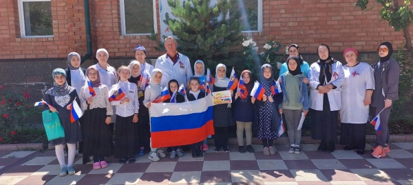 В этот же день колонна воспитанников с влагами РФ направилась в центральную районную больницу, где в кабинете главврача Курбана Рамазанова также раздали и надели на грудь медработникам триколор.