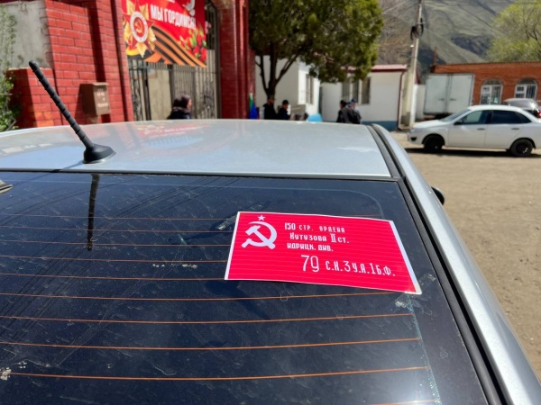 На автомашинах жителей Цуриба расклеили наклейки с изображением Знамени Победы.