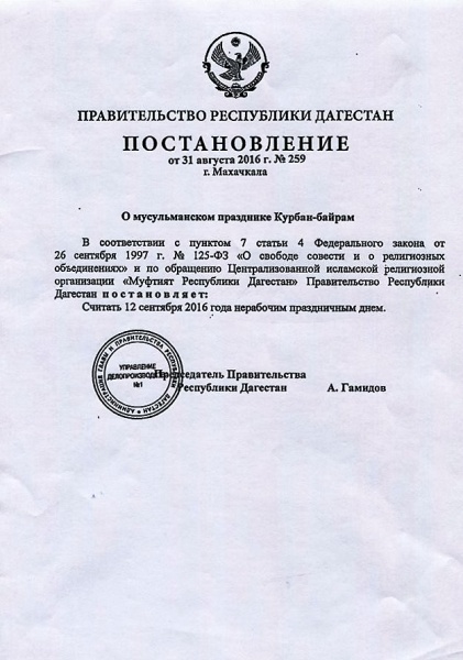 Постановление Правительства Республики Дагестан о мусульманском празднике Курбан-Байрам