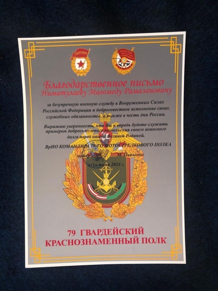 В Благодарственном письме от имени командира 79-го мотострелкового полка майора Павленко, где проходит срочную военную службу Магомед, отмечены честность и трудолюбие нашего земляка, его безупречная военная служба в Вооруженных Силах Российской Федерации и добросовестное исполнение своих служебных обязанностей.