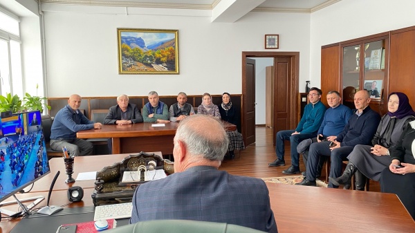 Работники аппарата администрации Чародинского района — заместители главы района, руководители структурных подразделений и специалисты, вместе смотрят в кабинете главы муниципалитета прямую линию Президента Российской Федерации Владимира Владимировича Путина.