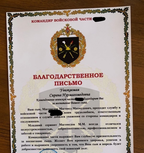 В письме, адресованном Сиране Нурмагомедовне, командование части выразило искреннюю благодарность за достойное воспитание сына. В нем отмечено, что Магомед Махмудович зарекомендовал себя как примерный военнослужащий, заслуживший уважение как командиров, так и своих сослуживцев. Его трудолюбие, ответственность и преданность воинскому долгу стали примером для других.
