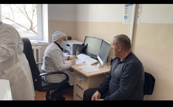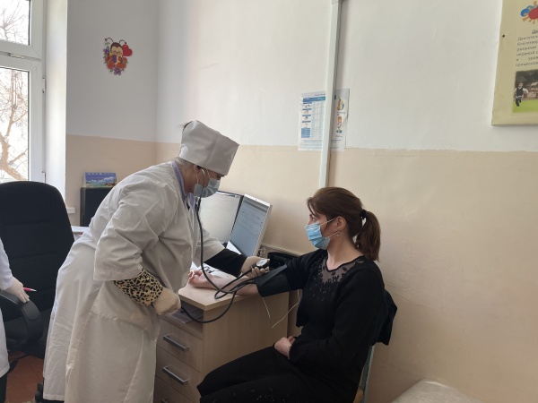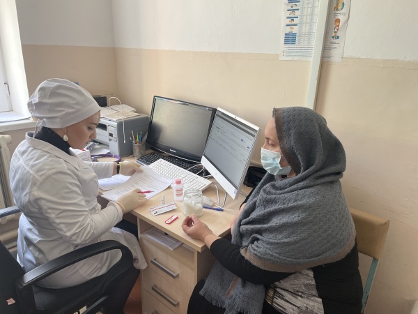 До прививки врач-терапевт Альбина Халикова вместе с медсестрой Гажар Ярбиловой провела осмотр – измерила давление, температуру тела и сатурацию, а также экспресс-тест на выявление антител. Тем у кого были антитела или имелись хронические заболевания вакцину не сделали.