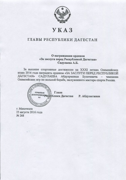 Указ главы Республики Дагестан о награждении орденом "За заслуги перед Республикой Дагестан" Садулаева А.Б.