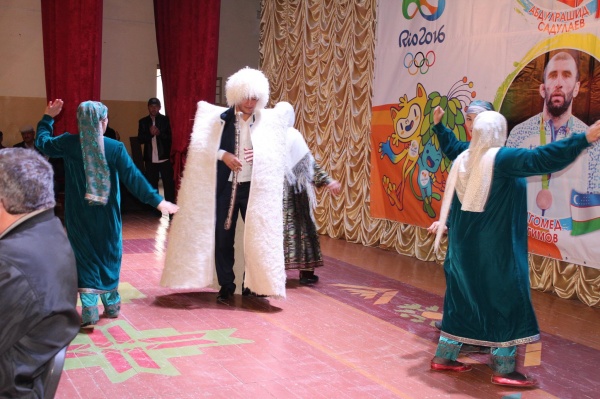 К часу дня во Дворе дома культуры под звуки зурны и барабана, с хлебом и солью героев Олимпиады и гостей встретили одетые в национальные формы работники отдела культуры и образования района. А концертный зал к этому времени был переполнен радостными жителями района в ожидании встречи с олимпийцами. Вместе с руководством района гости направились в зал.